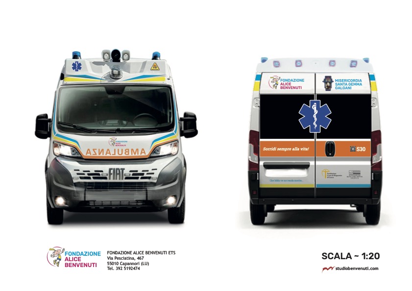 Un ringraziamento speciale va a Simone Benvenuti, curatore del progetto grafico. Con la passione e la professionalità ultra decennale conclamata che lo contraddistinguono Simone ha seguito ogni fase creativa delle grafiche dell’ambulanza, realizzando e adattando gli elementi estetici al layout del mezzo.